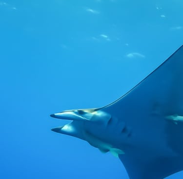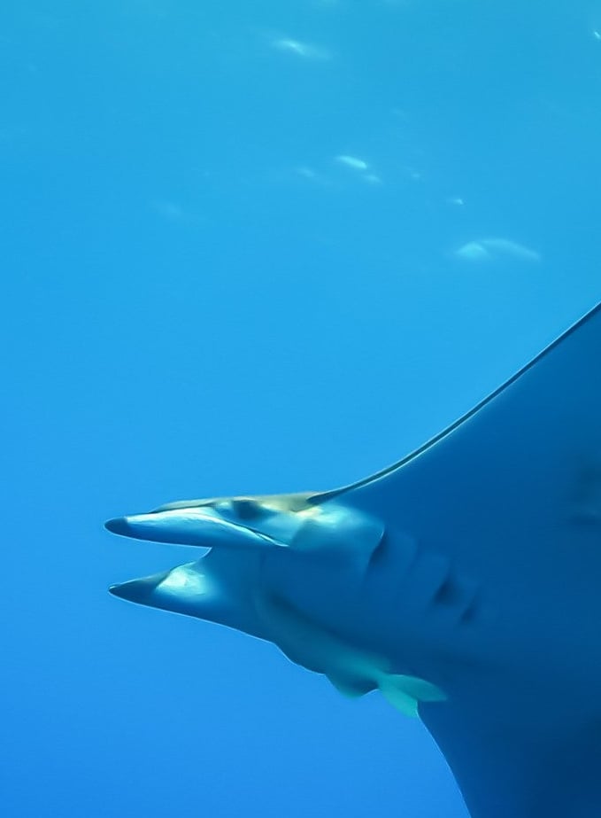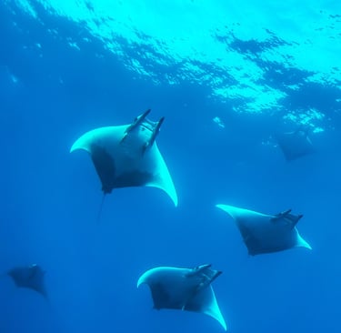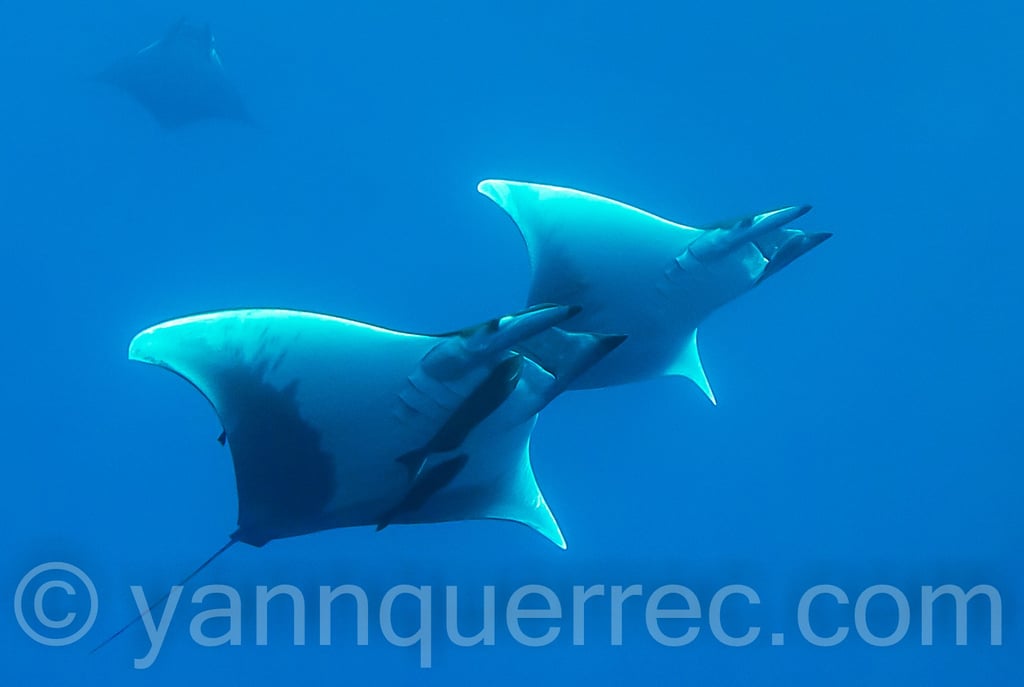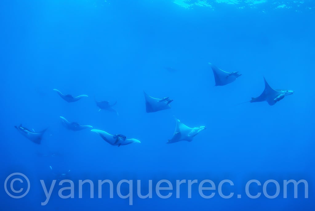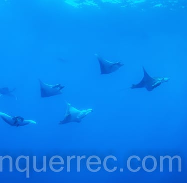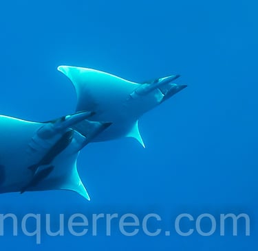 Les diables de mer (Mobula sp.) sont des géants pélagiques pouvant atteindre près de 4 mètres d'envergure. Ce sont des visiteurs saisonniers qui arrivent généralement aux Açores en été (de juin à octobre). Ils se rassemblent en groupes, souvent nombreux, au-dessus de monts sous-marins isolés, tels que "Baixa do Ambrosio" (au large de l'ile de Santa Maria) ou j'ai eu le bonheur et la chance de les rencontrer... Ces monts sous-marins situés au milieu de l'océan atlantique sont des "hotspots" écologiques. Leurs reliefs sous-marins provoquent des remontées de courants (upwelling) qui concentrent le zooplancton et le krill, leur principale source de nourriture.